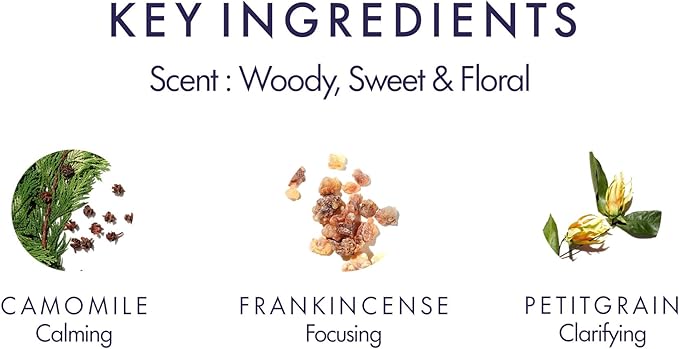 - Product Benefits : Calms and focuses the mind with Chamomile, Petitgrain and Frankincense essential oils.