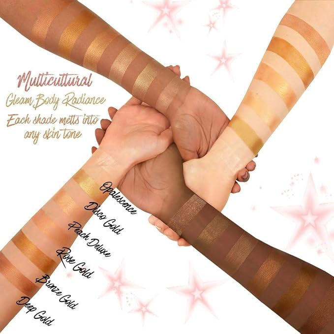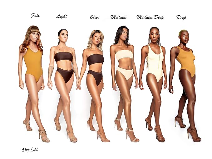 - Deep Gold: Deep Gold is a rich golden chocolate shade with red undertones that evokes a rich tropical glow. The perfect shade to perfect & even medium to dark skin tones, or for fair to medium skin tones use to achieve a dark rich tan from head to toe. Use as a primer for face, mix with foundation or all over body for perfected glowing skin. Gleamβs lightweight moisturizing makeup will help diminish minor imperfections while hydrating skin and improving skin appearance.