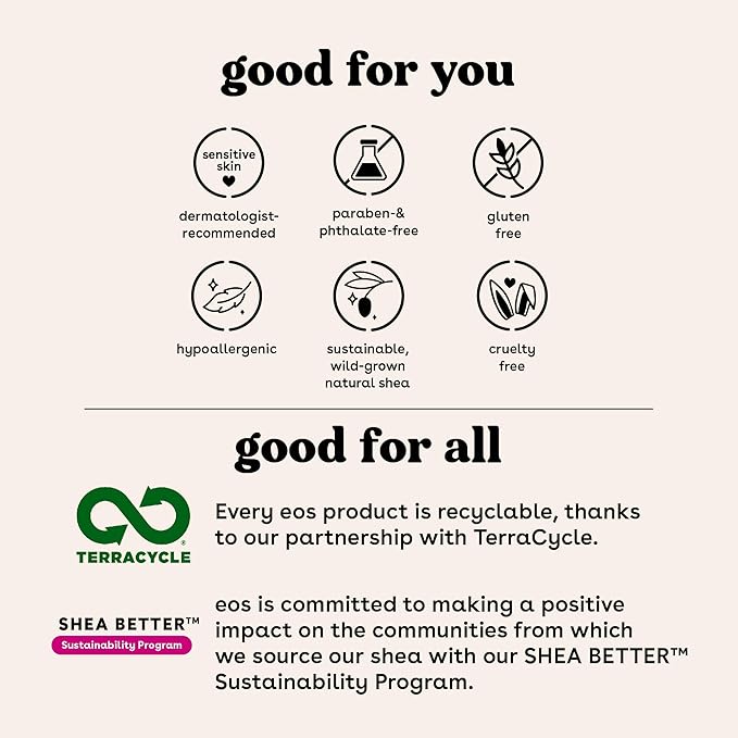 - SUSTAINABLY-SOURCED INGREDIENTS: eos lip balms have wild grown, sustainably sourced, 100% natural shea butter and oil to leave your lips smooth and nourished