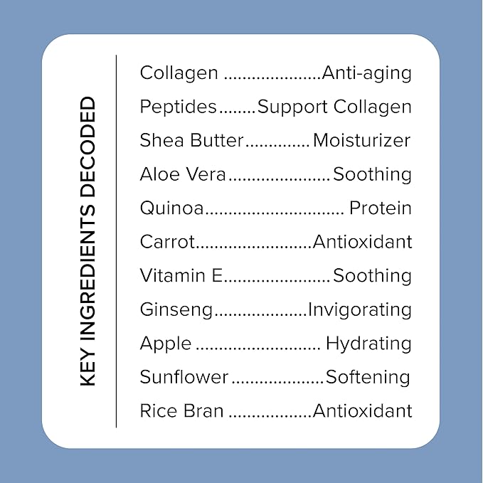 - NOURISHING + HYDRATING โ With age our skin loses elasticity & moisture, our Clinically-Tested, Dermatologist-Tested, & Allergy-Tested hydrating Collagen + Peptides formula visibly smooths the look of skin's rough texture, plumps overall skin tone, & replenishes essential moisture to visibly restore volume to areas prone to sagging, dark spots, & wrinkles. Nourish, hydrate, & plump your skin for a healthier, fuller, & younger appearance while also improving your skins elasticity all at once.