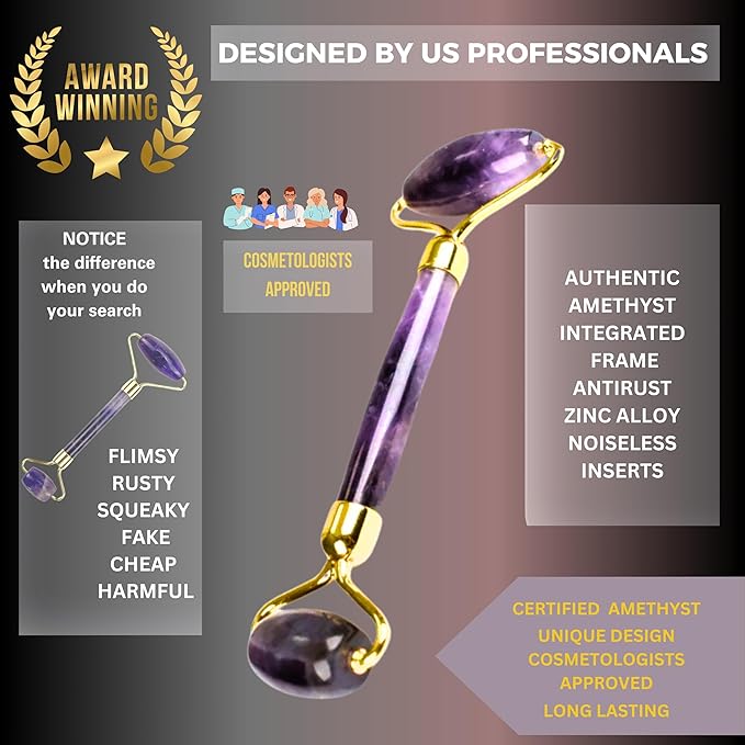 - Bonus Amethyst Guasha & Jade Roller - Noisless & Smooth USA Quality : Weβve seen those Jade Rollers too, you know the ones that squeak and break. This, is not those.But we use a hard, stainless steel integrated frame (all one piece) and two tiny βwheelsβ that we insert in the head of the roller which turns your roller smoothly and without a noice..