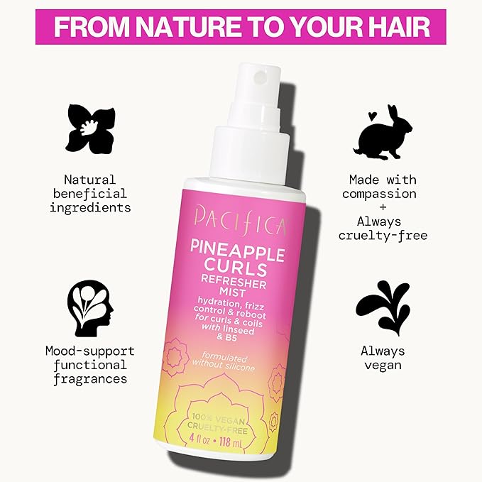Pacifica Pineapple Curls Refresher Mist Frizz Control Spray & Curly Hair Enhancing -w/Hyaluronic Acid Vitamin B5 & Natural Plant Oils Revitalizes Curls - Vegan Cruelty Free Dermatologist Tested