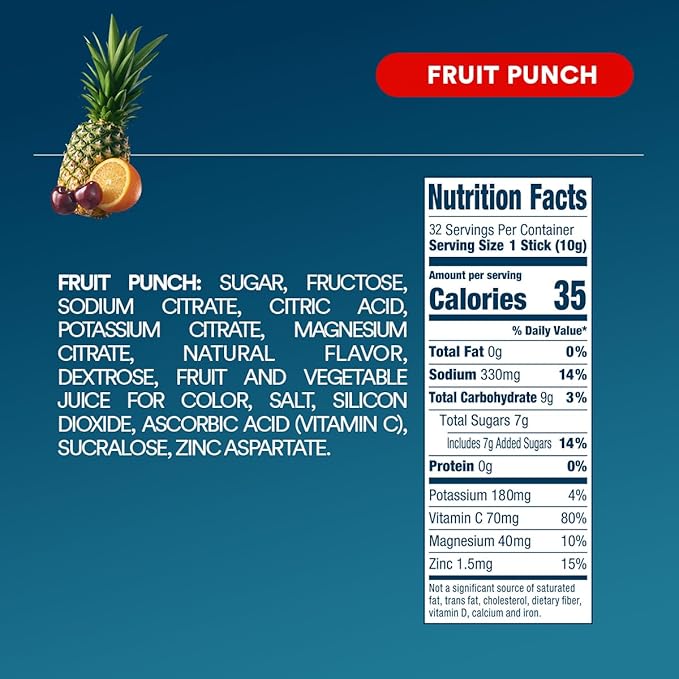 - CONVENIENT SINGLE-SERVE PACKETS: 32 portable Fruit Punch flavored electrolytes powder packets perfect to rehydrate on-the-go. Ideal for travel, sports activities, and daily use. Mix 1 packet into 8 oz of water for effective hydration.