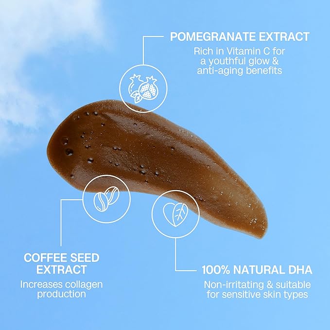 - 𝗛𝘆𝗱𝗿𝗮𝘁𝗶𝗻𝗴 𝗙𝗼𝗿𝗺𝘂𝗹𝗮 𝗙𝗼𝗿 𝗦𝗼𝗳𝘁, 𝗠𝗼𝗶𝘀𝘁𝘂𝗿𝗶𝘇𝗲𝗱: Skin Our self tanning mousse doubles as skincare, addressing dry skin concerns with premium hydrating ingredients. Formulated with soothing chamomile extract to calm sensitivity sunless tanner , antioxidant-rich coffee seed extract to fight free radicals, and rejuvenating pomegranate extract for intense moisture.