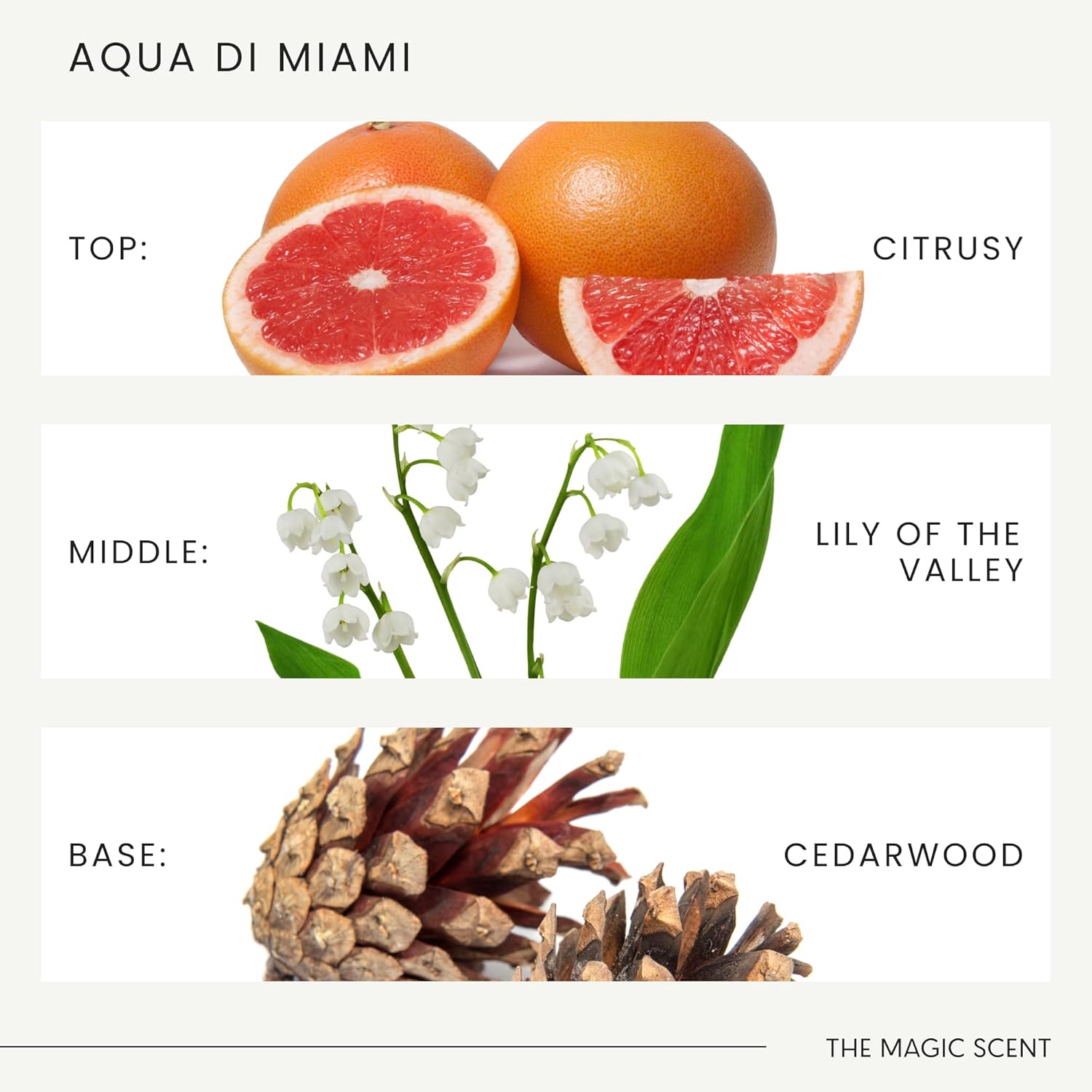 - PREMIUM BLEND OF NATURAL DIFFUSER OIL SCENTS - Expertly made in Miami, USA, Aqua di Miami is a statement of elegance, where clean notes of fresh breeze and citrus combine with a horizon of woody mineral and Lily of the Valley.