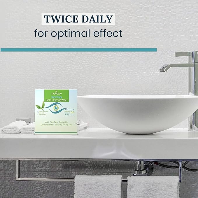 NOVEHA 120Pcs Tea Tree Oil Eyelid & Lash Wipes With Hyaluronic Acid, Green Tea & Chamomile For Blepharitis & Itchy Eyes, Individually Wrapped Eyelash Wipes, Natural Makeup Remover & Cleanser (2 Pack)