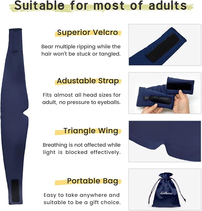 - Large Size & Adjustable: The eyemask is with Large Size to fit most head circumference and side-sleepers. You may adjust the strap to your suitable length via the Velcro, and the mask will no shift off easily. You wonβt feel any pressure on your face or your eye balls with this sleep face mask, and we believe that you will want to use it in the long term