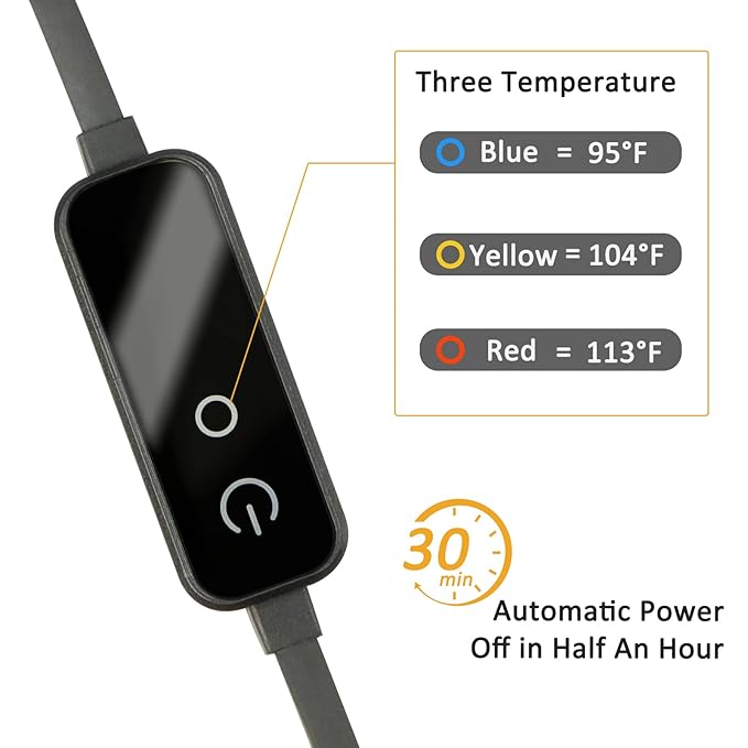 - Three levels of the temperature: The temperature lights will appear on the controller once you turn it on. Green light for Low temperature (95β), Blue light for medium temperature (104β), and Red light for High temperature (113β). Also, our heated eye mask has a protection system that will automatically turn off after half an hour.