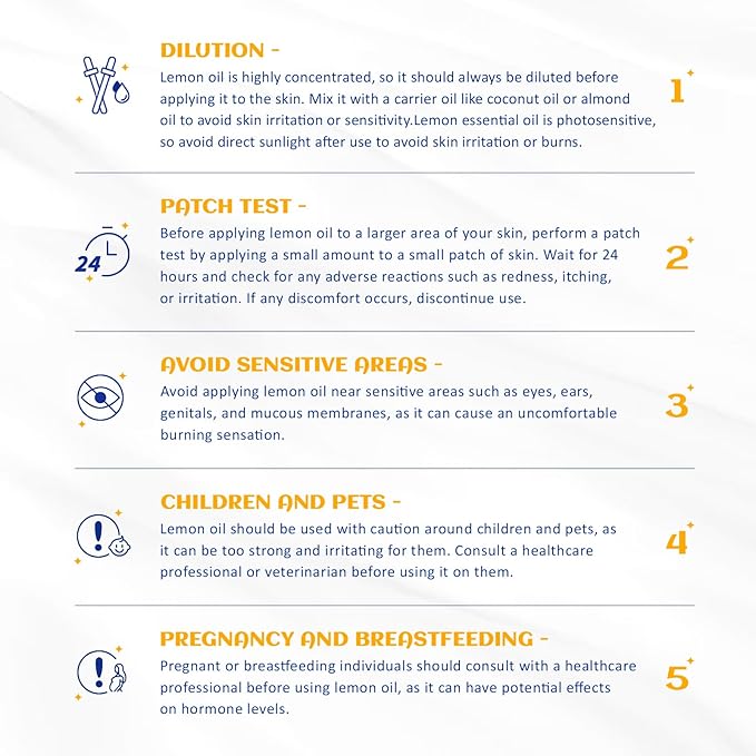 - Body Massage: Dilute 1 drop of lemon essential oil with 10 to 20 drops of a carrier oil (Sweet Almond, Grapeseed or Jojoba). Take an appropriate amount of the blended oil on your palm and apply the oil in a circular motion on the body parts that need to be massaged, which can relax the body and mind and relieve stress