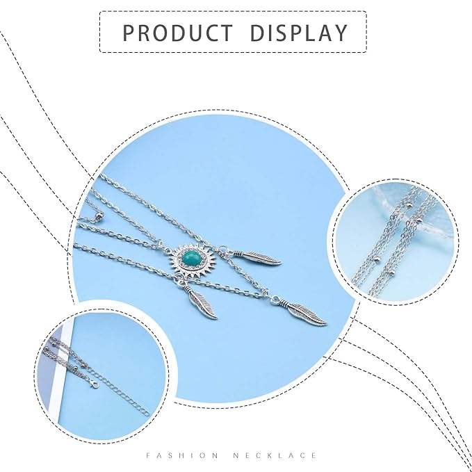 Boho Layered Feather Choker Necklace Turquoise Pendant Necklace Chain Vintage Crystal Paved Sun Necklace Silver Sunflower Necklace Jewelry for Women and Girls