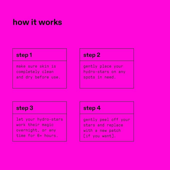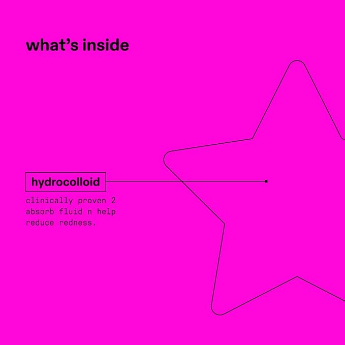 - CUTE & EFFECTIVE: A star-shaped pimple patch that's out of this world. Made with 100% hydrocolloid to help absorb fluid, reduce redness, and shrink spots while looking cute.