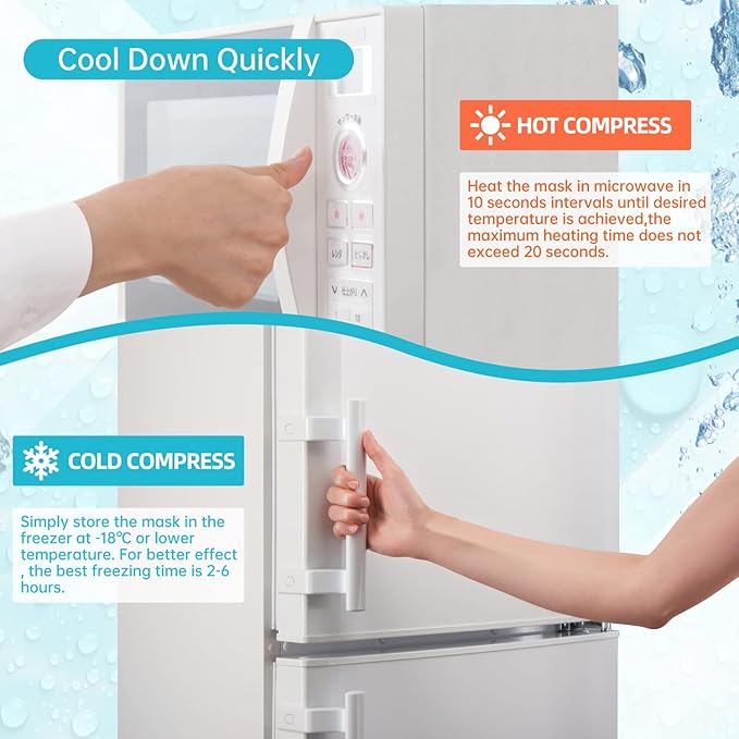 - 【Easy to Use】The ice eye mask and ice face mask can be used to your eyes or face interchangeably. Simply store the mask in the freezer at -18℃ or lower temperature. For better effect,the best freezing time is 2-6 hours. Heat the mask in microwave in 10-15seconds intervals until desired temperature is achieved,the maximum heating time of the gel face mask does not exceed 30 seconds and the maximum heating time of the gel eye mask does not exceed 20 seconds.