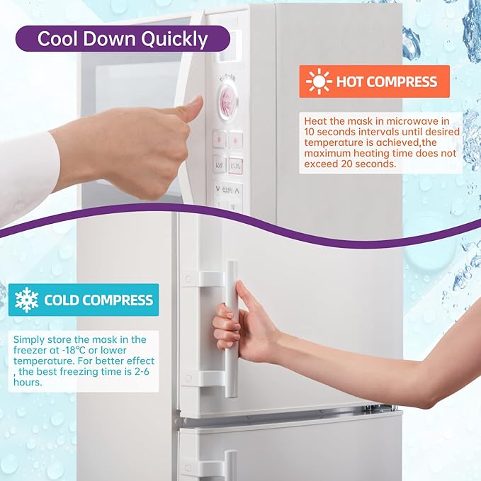 - 【Easy to Use】The ice eye mask and ice face mask can be used to your eyes or face interchangeably. Simply store the mask in the freezer at -18℃ or lower temperature. For better effect,the best freezing time is 2-6 hours. Heat the mask in microwave in 10-15seconds intervals until desired temperature is achieved,the maximum heating time of the gel face mask does not exceed 30 seconds and the maximum heating time of the gel eye mask does not exceed 20 seconds.