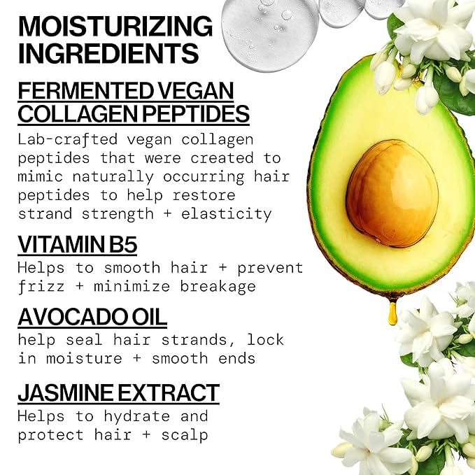- POWERFUL VEGAN COLLAGEN BLEND – Infused with a potent blend of plant-based ingredients that restore and protect. Fermented vegan collagen peptides help fortify strands and improve elasticity from the inside out; Pro-Vitamin B5 (panthenol) seals the hair cuticle to smooth flyaways and frizz, protecting against split ends. Avocado oil delivers rich omega fatty acids to deeply moisturize and help repair damage. Jasmine extract supports lasting hydration and a healthy scalp. Together, these actives transform dry, brittle hair into smooth, lustrous hair full of life.