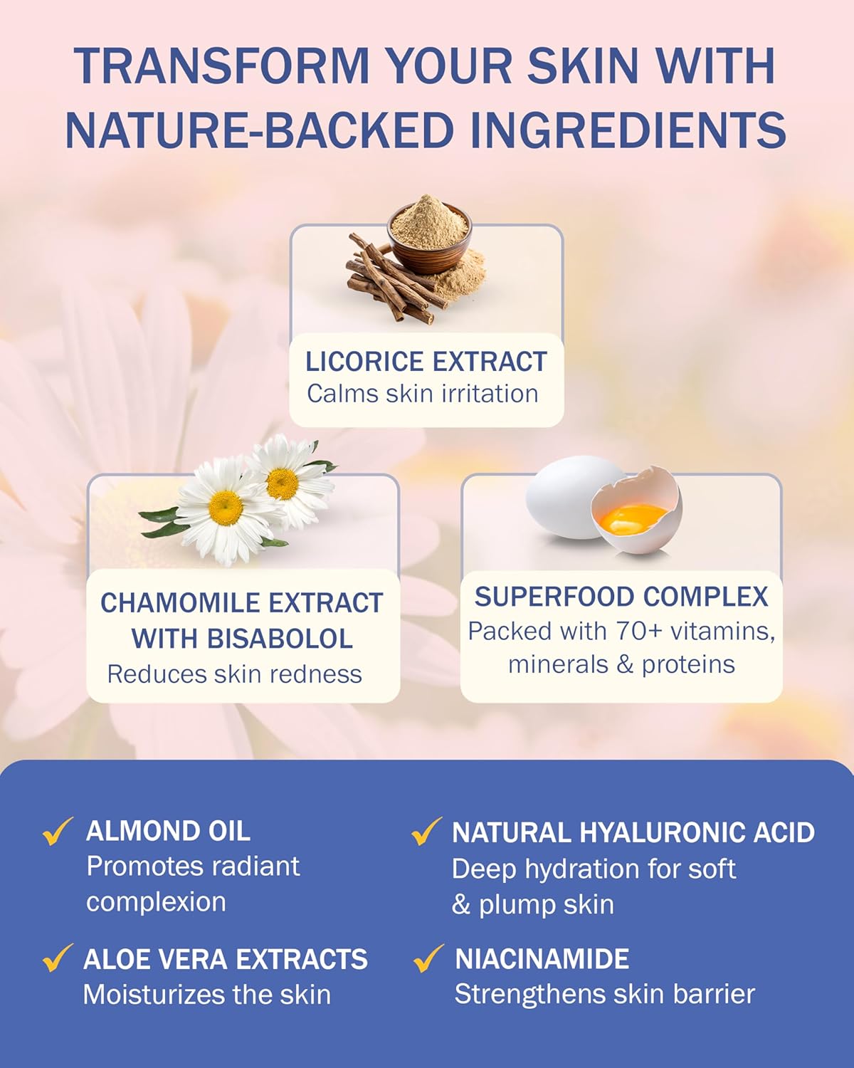 - Potent Natural Ingredients: Infused with licorice, chamomile extracts, aloe vera, and hyaluronic acid, our dry face moisturizer restore and strengthen the skin’s natural barrier for a lasting hydration and protection.