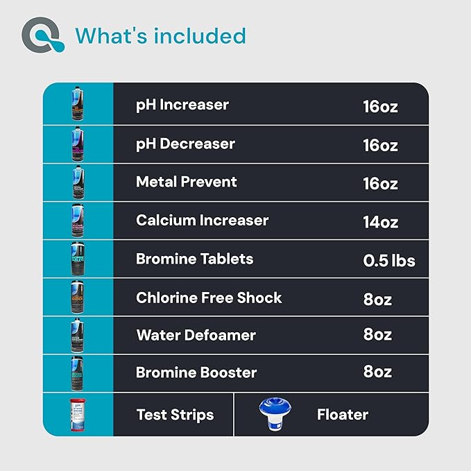 - CUSTOMIZED FOR INFLATABLE TUBS: Includes Bromine Tablets, Bromine Booster, pH Increaser, pH Decreaser, Calcium Hardness Increaser, Chlorine-free Shock, Metal Prevent, Defoamer, Water Test Strips, and a Floater—everything your inflatable spa needs.