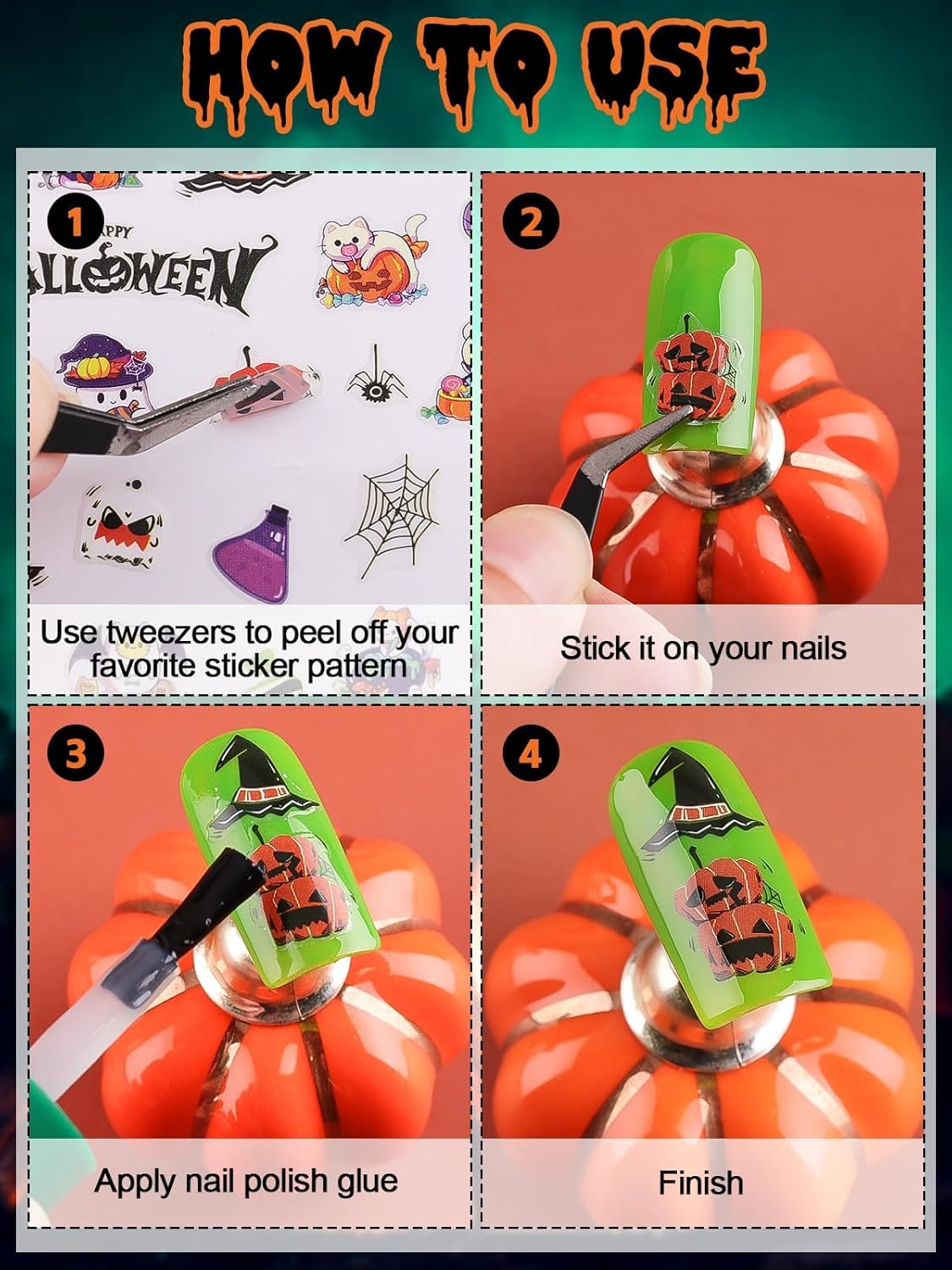 - γEasy to Useγ3D Self-adhesive Halloween nail stickers make it easy to stick well on your nail. Just use tweezers to peel and stick it on your nail. We suggest you can also use nail gel top coat to cover to make the stickers last longer. These are NOT water transfer ones!