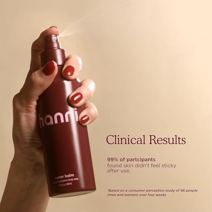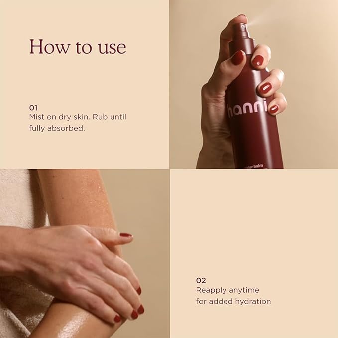 - BODY MIST: Water balm is a weightless body mist that replaces your body lotion but feels as light as water on skin, leaving no residue left behind. Pro-tip: if you're going hair-free, pair with the hanni weighted razor for the smoothest, softest skin.
