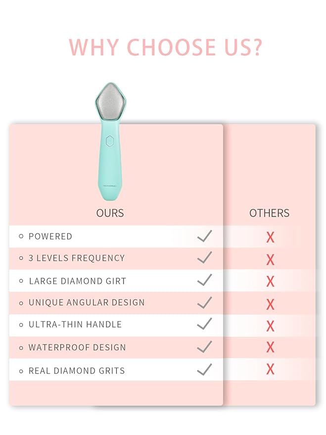 - ✔️[Large Diamond Head]What is it?This is a patented design waterproof at-home microdermabrasion tool with a large diamond head for gentle yet effective exfoliation.The facial machine is made of high grade material, which is durable, no irritation, non-invasive, and easy to use.We advise use gently on damp skin once every two weeks.