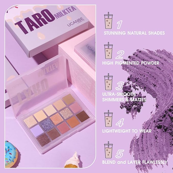 - β€. This eye palette is inspired by taro milk tea, mixture of 15 stunning warm and cool toned shades that velvety & go on smoothly texture with matte shimmery finishes to create next level looks to unleash your artistry. Each high pigmented, easy to blend, buildable, and long-lasting, created to suit every skin tone and eye color.