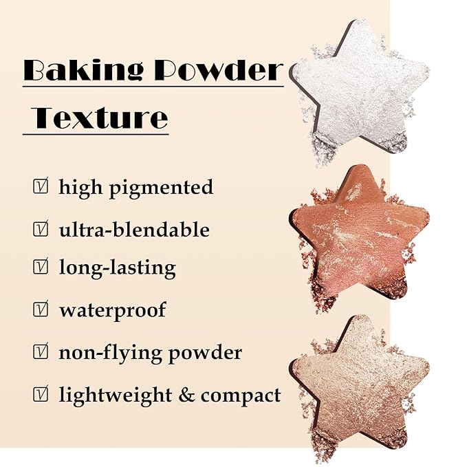 - Baked Highlighter & Blusher: Creamy fine and no fly powder, blendable blush baked powder with natural glow to brighten cheeks for glowing that shape, contour and highlight your brilliant three-dimensional facial features.