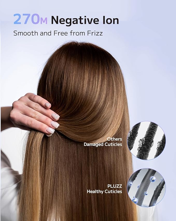 - PROTECT AND IMPROVE YOUR HAIR: With 270 million negative ions, the PLUZZ hair dryer helps balance hair static, leaving your hair smoother and softer. It prevents over-drying and keeps your hair bright and shiny. The PLUZZ hair dryer truly delivers fast and healthy results. The PLUZZ ionic hair dryer is perfect for women, men, and kidsβa great gift for anyone.