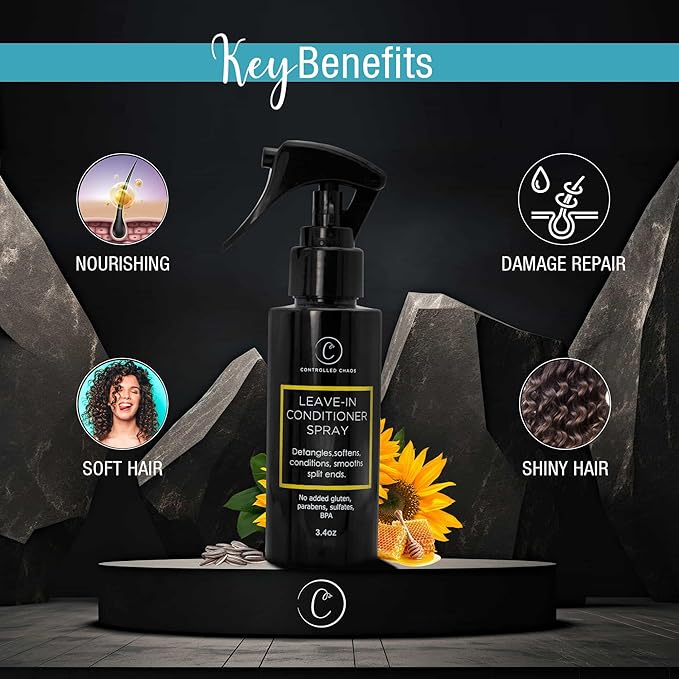 - Infused With Natural Ingredients: Controlled Chaos leave-in conditioner spray for curly hair stands out from other anti-frizz products with its all-natural ingredients. It has watermelon seed oil, sunflower seed oil, and honey as key ingredients. Watermelon seed oil nourishes your hair, sunflower seed oil provides deep hydration and enhances shine, while honey adds moisture and softness. Free from glutens, parabens, and sulfates, making it a gentle, non-toxic choice for all hair types.
