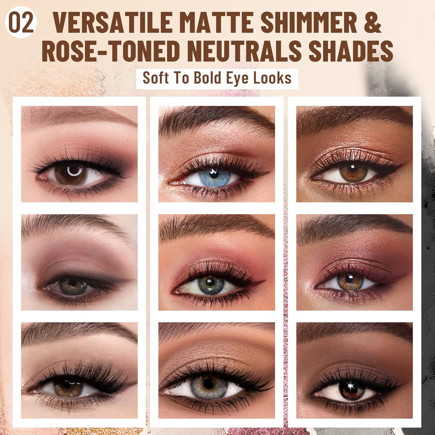 - 【Create Looks for All Occasions】This nude eye shadow palette allows you to effortlessly create a variety of eye-catching looks for any occasion. Whether you prefer a subtle, everyday elegance or a bold, smokey eye, it has you covered. The matte & shimmer finish of the shades adds depth and dimension to your eyes, enhancing their natural beauty.
