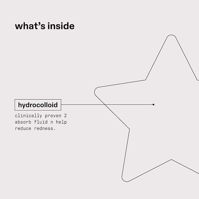 - CUTE & EFFECTIVE: A star-shaped pimple patch that's out of this world. Made with 100% hydrocolloid to help absorb fluid, reduce redness, and shrink spots while looking cute.