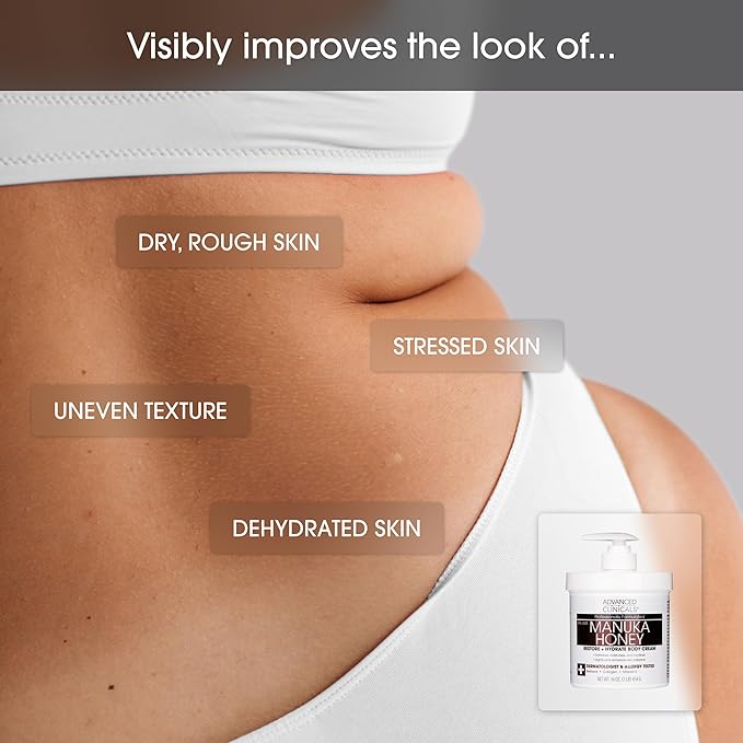 - MANUKA HONEY BODY CREAM NOURISHES & SOFTENS DRY, ROUGH SKIN โ This Manuka Honey + Collagen body cream provides hydration to soothe and replenish dry, textured skin. It promotes a softer, more comfortable complexion, leaving skin visibly renewed and nourished. Suitable body cream for women and men. This rich, velvety body moisturizing formula is rich like a body butter, but without a greasy finish. Skin feels smooth and hydrated for a visibly firm look.