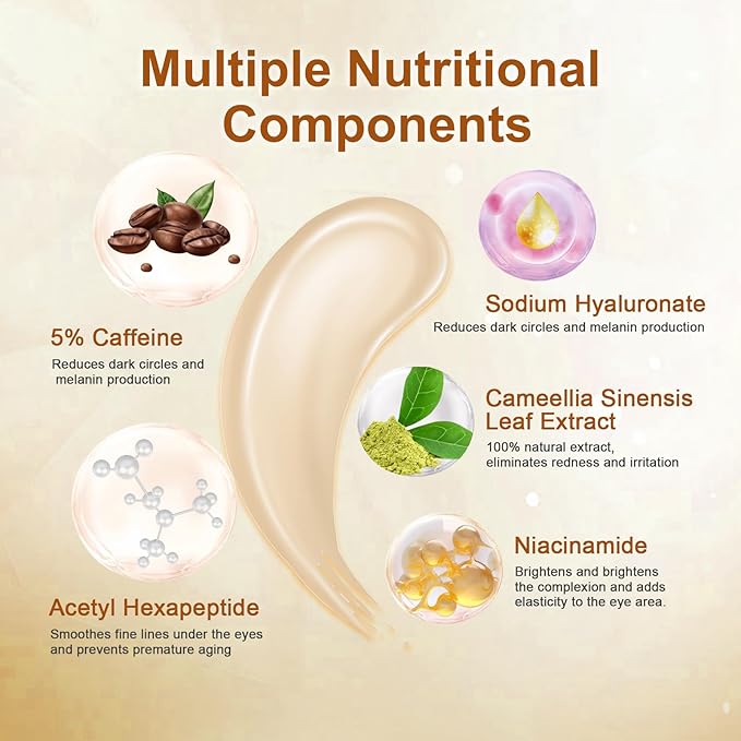 - 【Hydrating Eye Cream】 Ceramides,Acetyl,Hexapeptide-8,Palmitoyl,Tripeptide-5,Sodium,Hyaluronate,Caffeine,etc. It effectively smoothes fine lines and dark circles and provides long-lasting hydration
