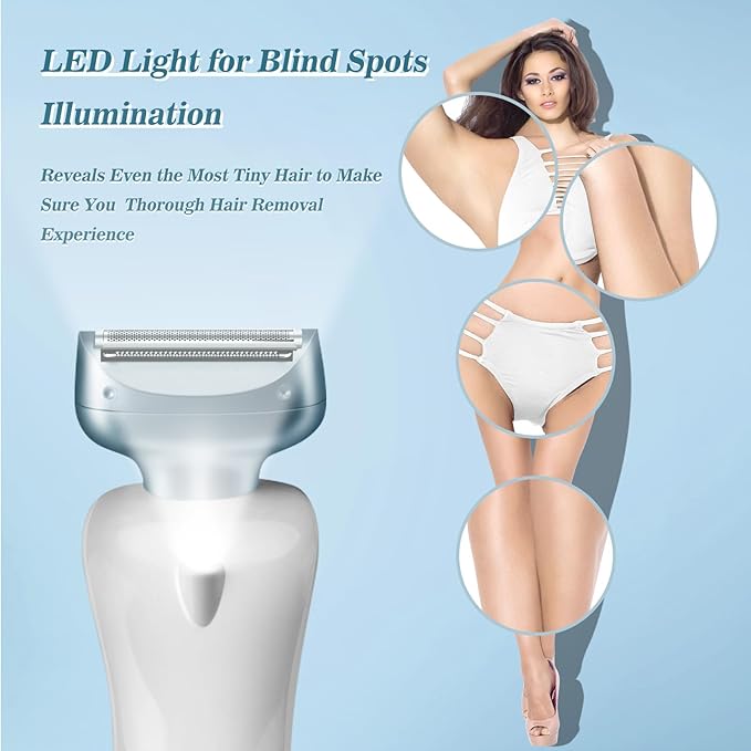 - [Built-in LED Light & Low Noise design] - Womens electric shaver built-in LED light automatically turns on once the shaver begins to operate, and it can aid you to see everything clearly even the smallest hair, ensuring thorough shave and trimming.Low noise design allows you a comfortable shaving experience.