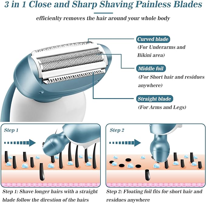 - [Customized Shaving without Residue]- Akunbem women electric shaver adopts 3 in 1 high-speed and sharp blades, it helps safe and clean shave hair on your body etc in minutes ,such as arms, legs, armpits and bikini line and other customized shaving , remove the unwanted hair without any residue.