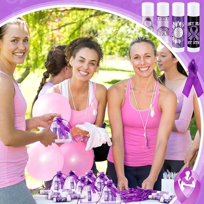 50 Set Overdose Awareness Lip Balms Gifts with 50 Organza Bags 50 Purple Awareness Ribbon Pins Raise Awareness for Domestic Violence Pancreatic Cancer Lupus Alzheimer's Awareness