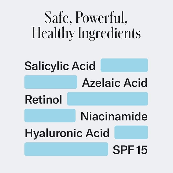 - SAFE, POWERFUL, HEALTHY INGREDIENTS: No Benzoyl Peroxide. A dermatologist-tested formula including Salicylic Acid, Azelaic Acid, Hyaluronic Acid, Niacinamide, and and increasing level of Retinol will help prevent new breakouts and heal acne scarring.