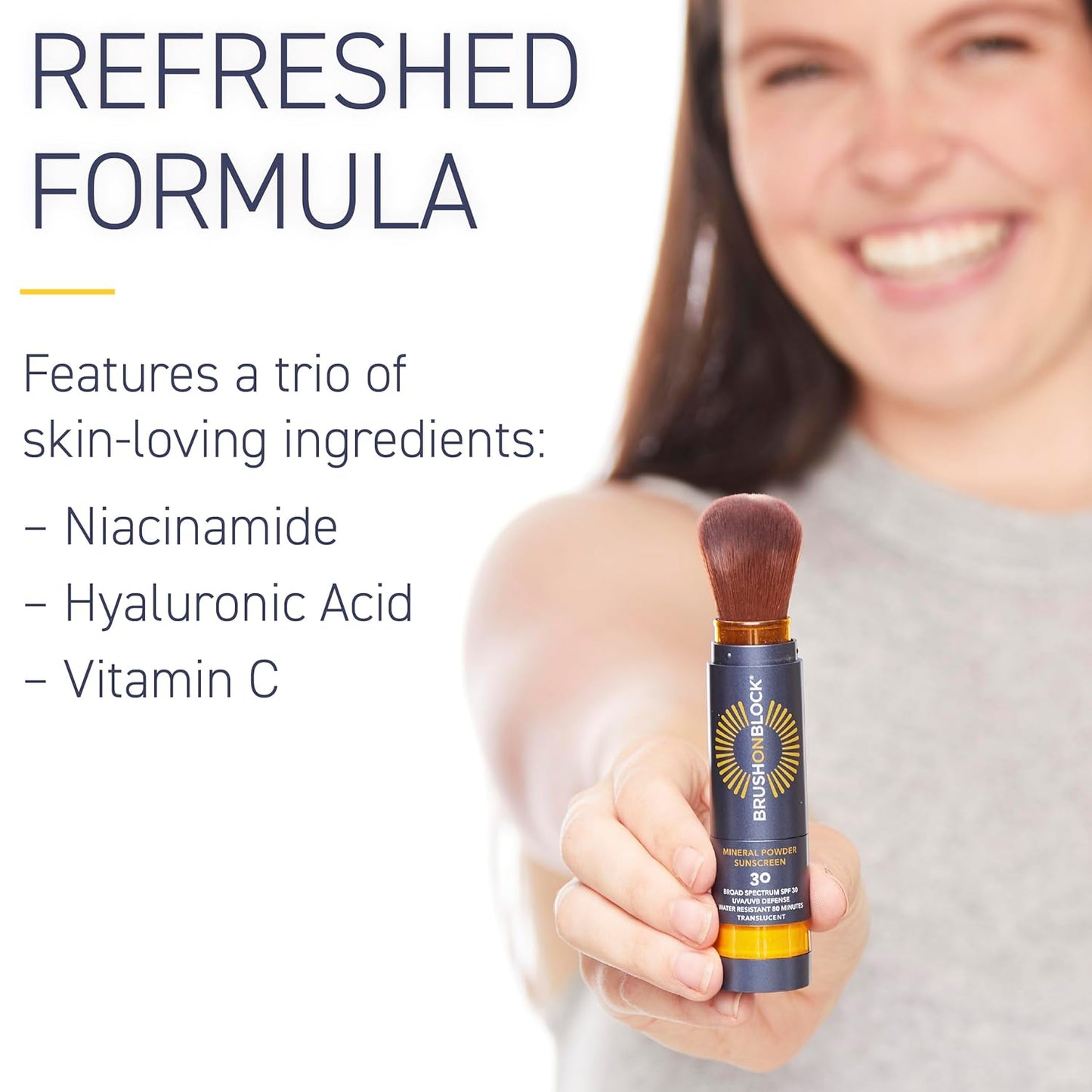 Brush On Block SPF 30 Mineral Powder Sunscreen New Formula, With Niacinamide, Hyaluronic Acid, & Vitamin C, Broad Spectrum, Water Resistant, Translucent, For All Skin Types, Reef Friendly, Mfg in USA