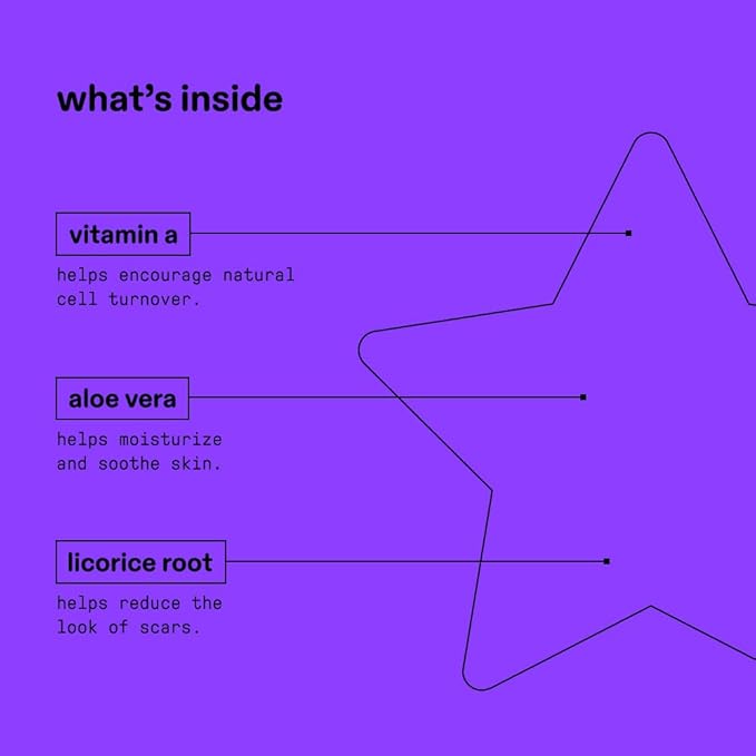 - STAR INGREDIENTS: Vitamin a, which encourages natural cell turnover, is combined with calming aloe vera, licorice root, a plant-based extract that helps reduce the look of scars, and hydrocolloid to support skin recovery after picking.
