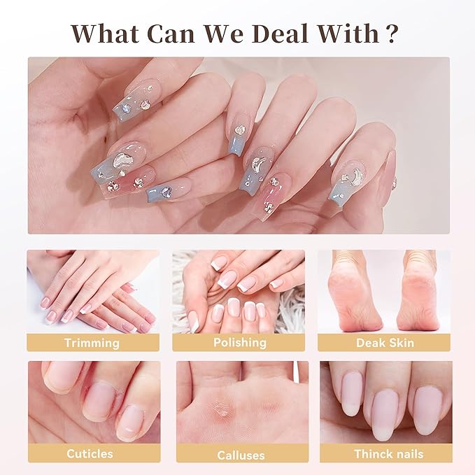 - 8-In-1 Manicure Pedicure Kit: Contains 8 drill bits for all your manicure and pedicure needs. This electric nail drill kit easily trim, sand, shape and polish nails to remove cuticles, calluses and dead skin. Enjoy a salon quality professional manicure at home. Suitable for everyone - women, men, seniors, pets and more. Perfect gift for nail lovers