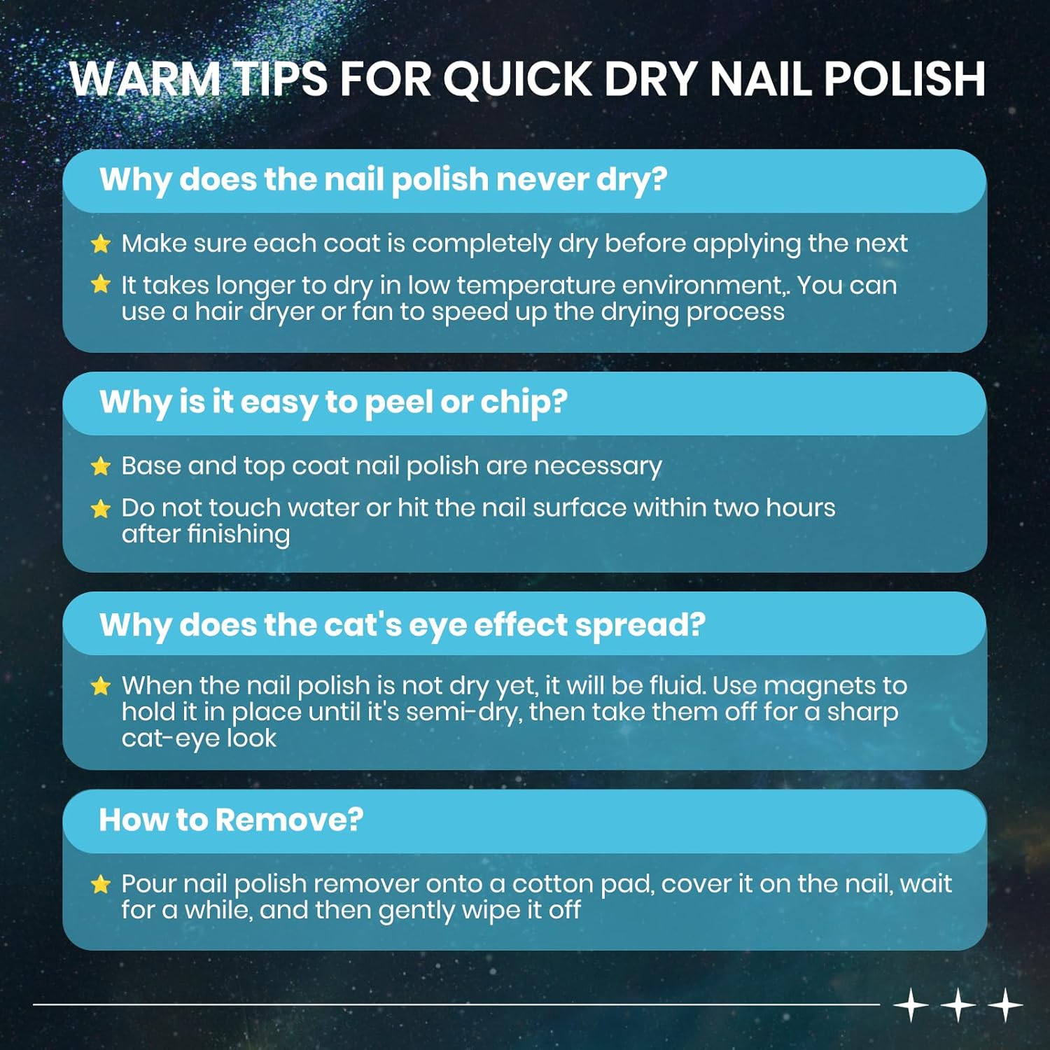 - Important Tips: 1. When the nail polish is not dry yet, it will be fluid. Use magnets to hold it in place until it's semi-dry, then take them off for a sharp cat-eye look 2. Do not touch water or hit the nail surface within two hours after finishing to avoid peeling; 3. Base and top coat nail polish art necessary