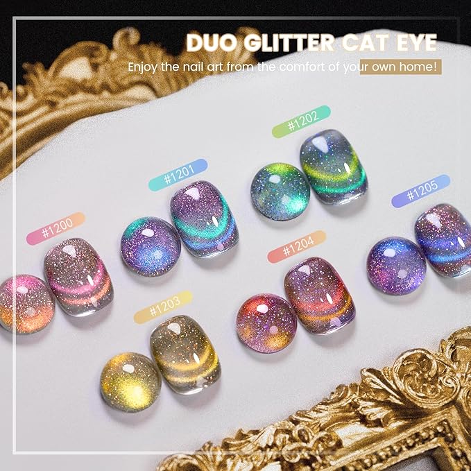 - CHAMELEON CAT EYE EFFECT:9d multi color glitter cat eye gel nail polish looks with 6 vibrant shades (red,pink,purple,orange,blue,green) that create a shimmering, multi dimensional galaxy effect under light. Made with magnetic cateye shimmers pigments,our new shades create optical nail-lusions that move with every angle