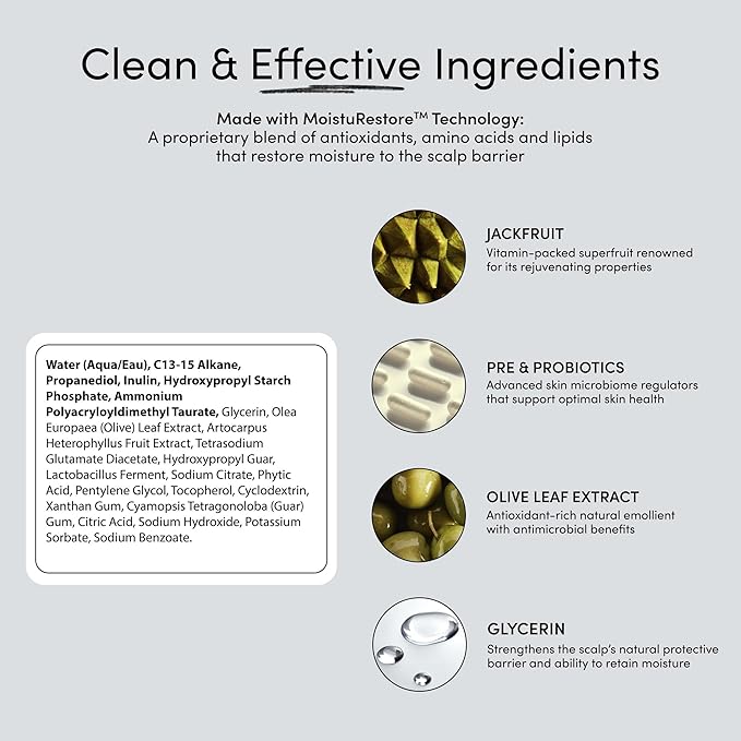 - Infused with Nature-Powered Ingredients: Includes Jackfruit (rich in antioxidants and vitamins to rejuvenate skin), Olive Leaf Extract, Pre & Probiotics (to balance the scalpβs microbiome), and Glycerin (to lock in moisture and strengthen the scalp's protective barrier).