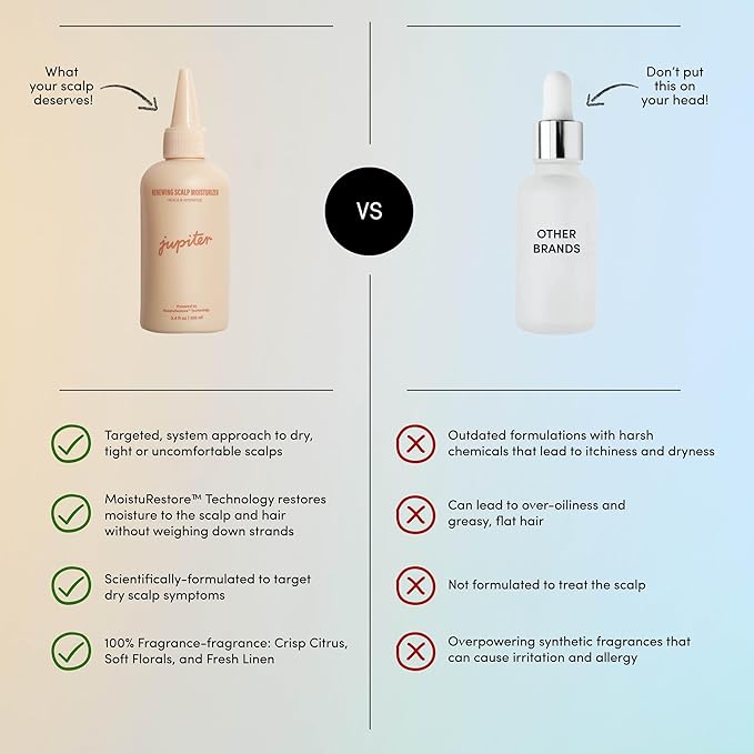 - Renewing Scalp Moisturizer vs. Restoring Serum - The Key Difference: Jupiterβs Renewing Scalp Moisturizer is specially designed to hydrate and strengthen dry scalps, featuring Aloe Vera and B-vitamins for a smoother, healthier scalp and hair. In contrast, the Restoring Serum is a medicated treatment with Zinc Pyrithione, targeting dandruff and flaking.