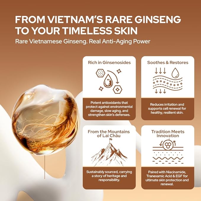 - Infused with 6-Year-Old Vietnamese Ginseng – Rich in rare Ginsenosides (precious ginseng saponins), this powerful botanical rejuvenates skin at the cellular level, enhancing vitality, boosting elasticity, and promoting timeless beauty from within.