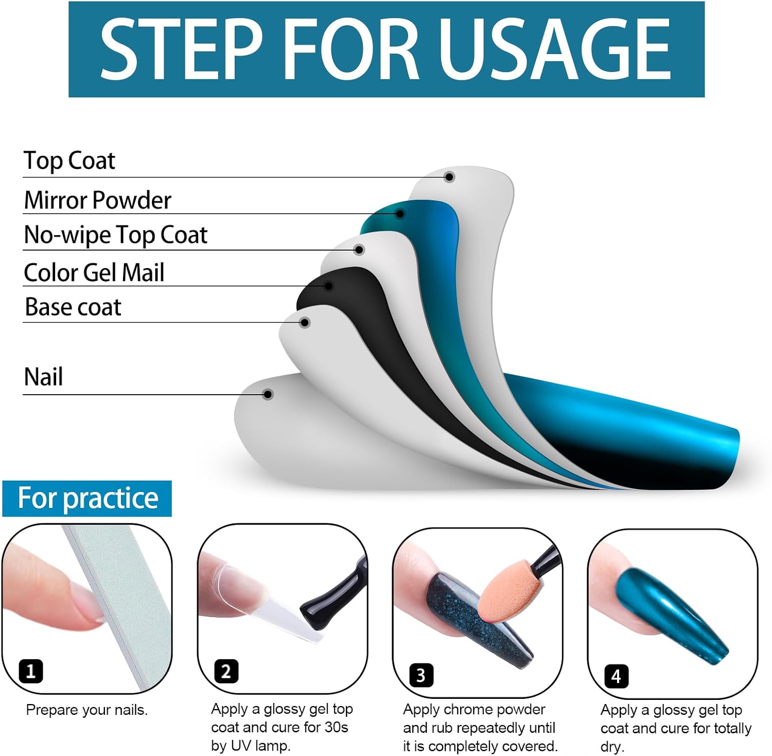 - PACKAGE CONTENTS:1 PCS chrome nail mirror pigment powders. It needs to be used with gel nail polish and no wipe top coat. They can make many different design for your gel nail polish. It gives different color base a pearly shine for your nails