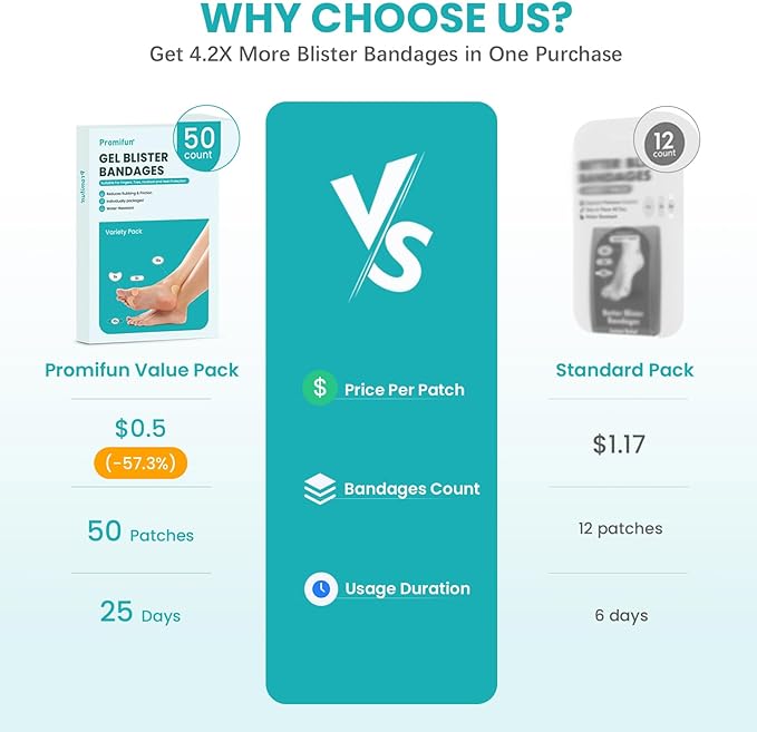 - 【Gentle Adhesive & No Residue】Designed for comfort, our bandages stay put without irritating your skin. Promifun blister pads can be applied to various body parts like feet, toes, heels, soles, and fingers. The gentle adhesive allows for easy removal without leaving residue, perfect for sensitive skin.