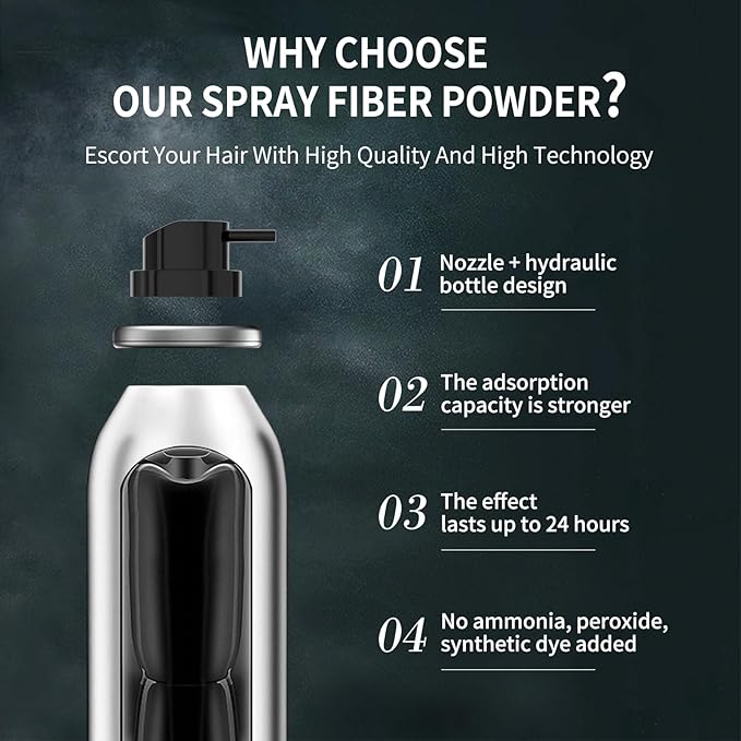 - Experience the magic of our hair building fibers spray! Made from natural, static-charged fibers, it creates a natural-looking cover for hair loss, blending perfectly with your existing hair. Enjoy a full hair fiber spray effect that's both wind and rain resistant, yet easy to wash out