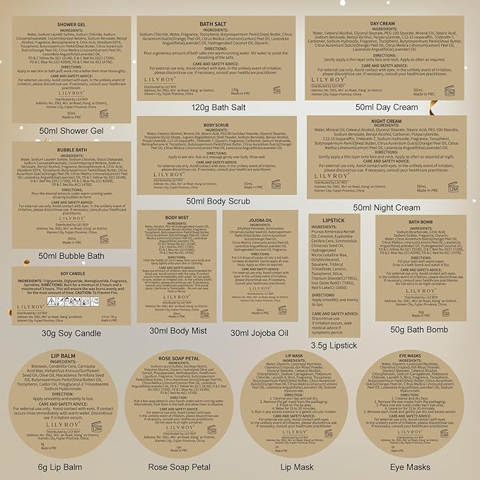 - 25Pcs Happy Birthday Gifts for Women Mom: 50ml Shower Gel, 50ml Bubble Bath, 50ml Day Cream, 50ml Night Cream, 50ml Body Scrub, 30ml Jojoba Oil, 30ml Body Mist, 120g Bath Salt, 50g Birthday Fizzer, 30g Birthday Candle, Eye Masks, Lip Mask, Lip Balm, Lipstick, Keychain, Necklece, Bath Towel, Key Bottle Opener, Massager Comb, Silk Sleep Mask, Nail Clippers, Bath Sponge, 5g Dry Flower, Soap Flower packaged in a nice beautiful Paper Gift Box. The birthday spa gift sets for women offer the most luxurious and perfect bath experience