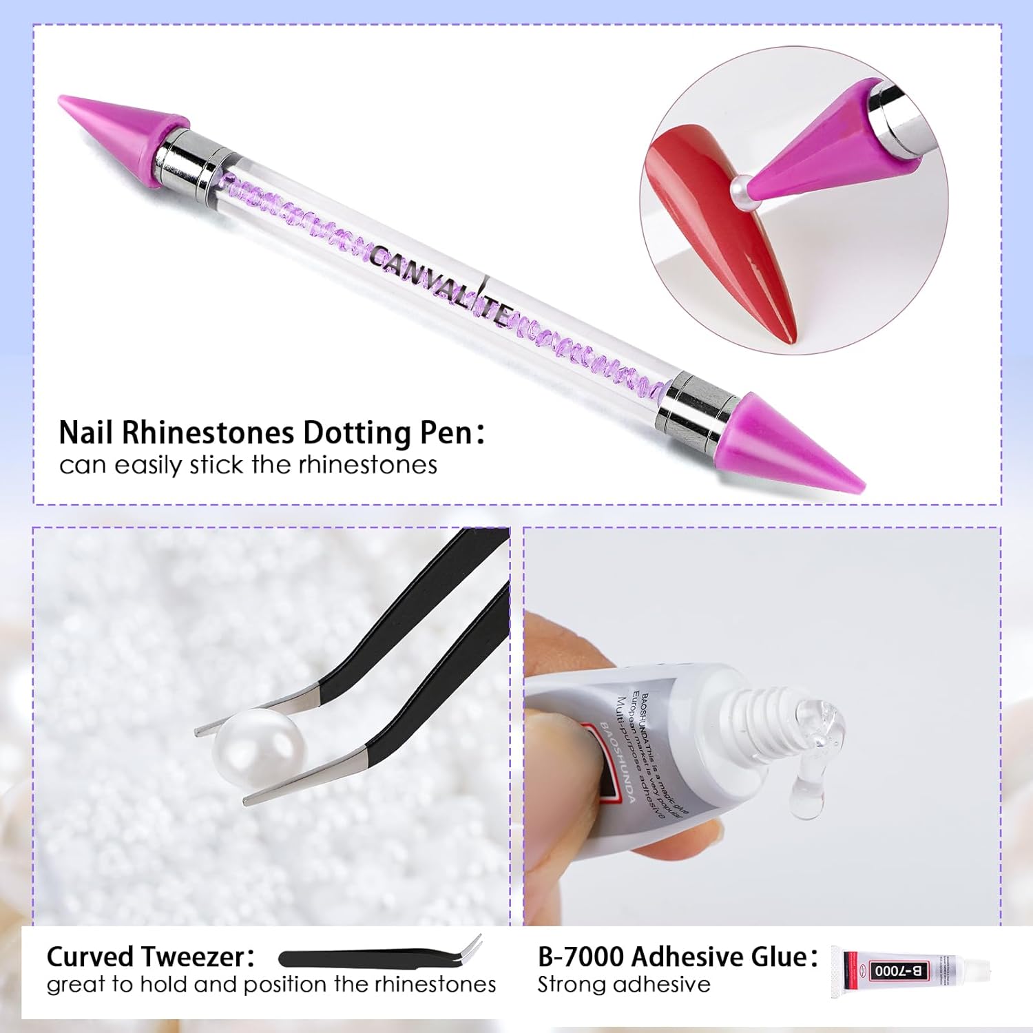 - Easy to Use: Glue fix pearls for nail art, these half pearls have a flatback matte bottom with firmer adhesion and they are not easy to fall. The dotting pen and pick up tweezer are easy to use, helping you pick up and set nail rhinestones and charms easily. (5x 3ml glues are included in the package)