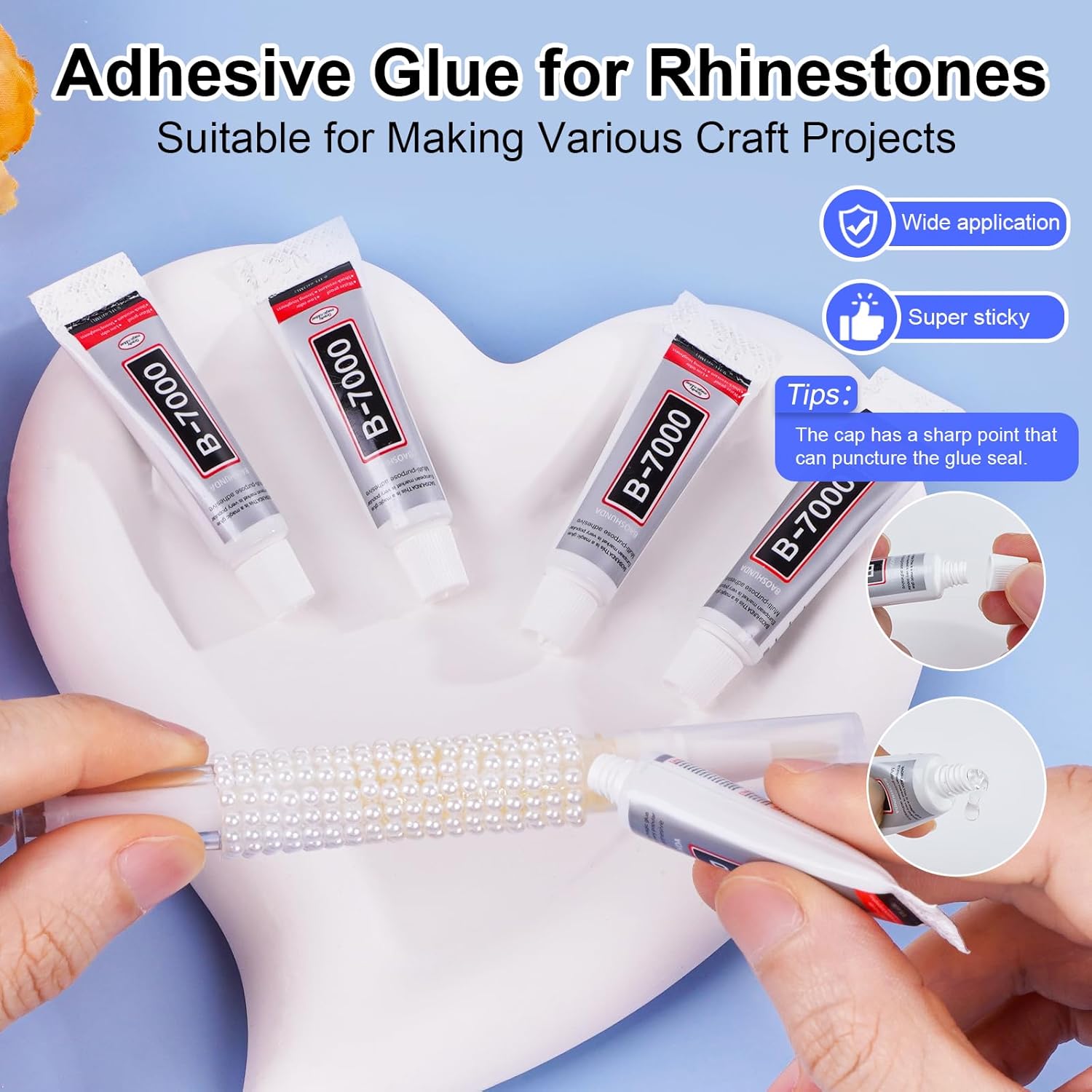 - 5Pcs B7000 Clear Glue: Our B7000 jewels glue for gems is a powerful adhesive that goes on clear and is safe for your skin. It comes with a fine tip for precise application. It starts to set in 3-5 minutes and is fully set in 24 hours. To prevent any initial leakage, let the glue sit with the tip up for a few minutes before using. Remember to clean the tip with an alcohol wipe after each use.
