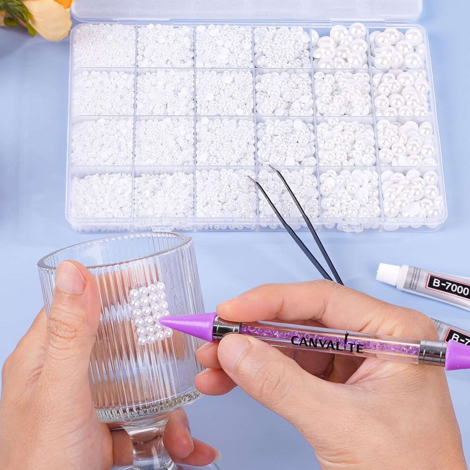 Canvalite 11000Pcs Flatback Pearls for Crafting, Multiple Sizes Half Nail Pearls with 5Pcs B7000 Jewelry Glues & Picker Tools Bedazzling Bead for DIY Crafts Clothing Tumblers Shoes Decors Nail Art